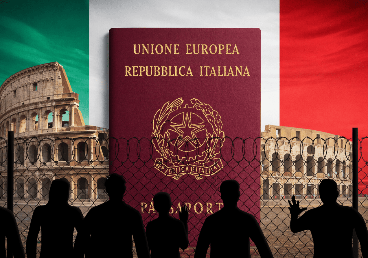 Esta imagen transmite una idea clara y contundente: una barrera alambrada y fortificada se interpone entre las personas y el pasaporte italiano, símbolo de un derecho que hoy parece cada vez más inaccesible.